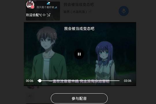 3、如果你想要查看此配音的内容,只需点击其中的配音作品进行观看与试听;如果你想要开始尝试共同配音,只需点击下方的“参与配音”选项,也可以在上一步点击“配音”图标功能即可,如下图所示: