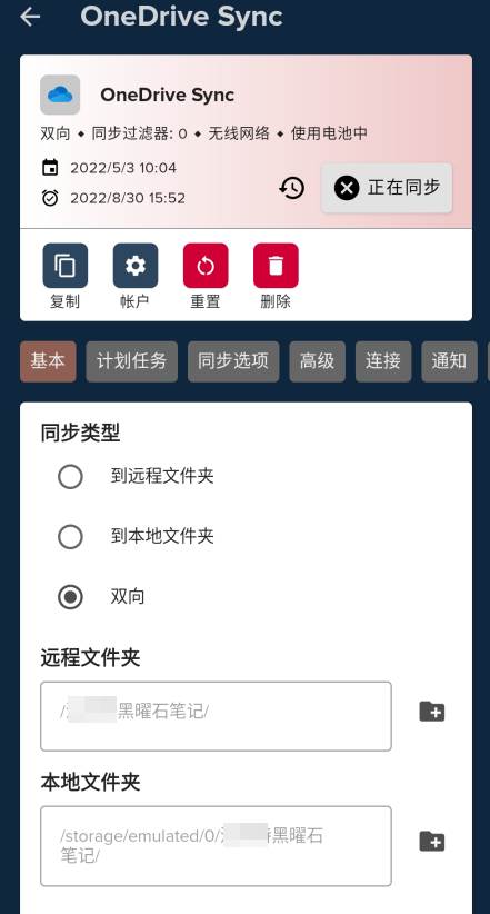 4、然后在手机上用FolderSync来同步Onedrive。远程文件夹选择云端的Obsidian文件夹,本地文件夹选择手机上的Obsidian文件夹。类型选择双向同步。