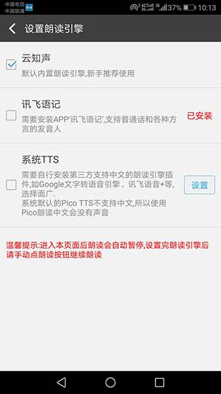 4、在设置中,您还可以选择朗读引擎;文字朗读神器支持多种朗读引擎,包括云知声、讯飞语记和系统TTS;每种引擎都有其独特的特点和优势,您可以根据自己的需求选择合适的引擎;