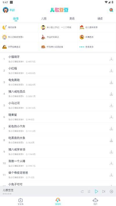 1、儿歌播放:提供海量的优质儿歌,包括中文儿歌、英文儿歌、古典儿歌等,风格多样,涵盖欢快的律动儿歌、温馨的睡前儿歌、富有教育意义的启蒙儿歌等。