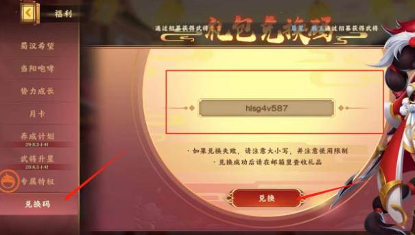 进入福利后,点击左下角的兑换码,在空白处输入自己拥有的兑换码后点击兑换即可
