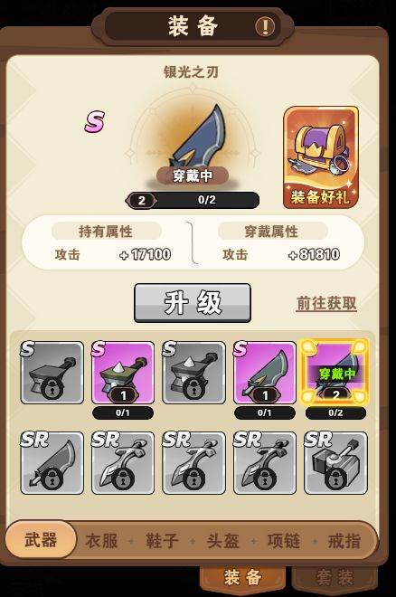 《闪耀战记》共有6个等级的装备,需要收集一定数量的相同装备即可进行合成来提升装备等级。看得眼花缭乱?建议前往角色界面一键升级。装备套装通过收集激活,当套装中的装备都达到对应等级时,即可升级套装获得更高的属性加成。