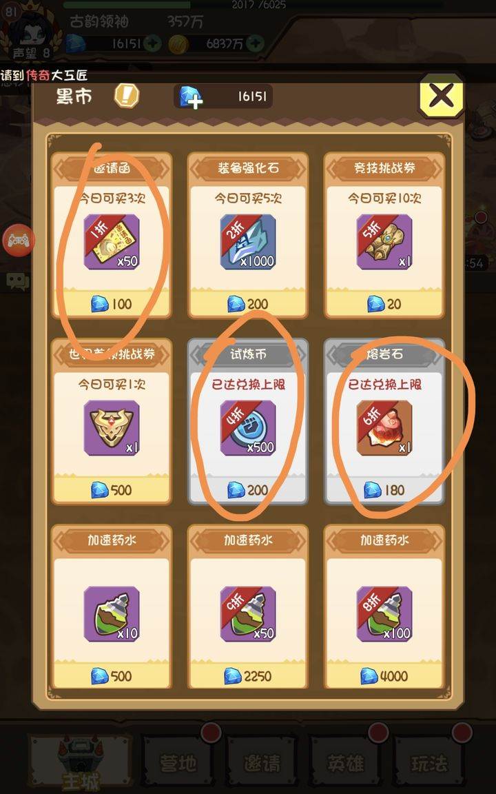 1邀请函不用挂机,离线直接会邀请,这点挺好.如果零氪玩家可以先做任务存钻石,然后进入图1黑市只够买邀请函试炼币跟熔岩石10次那个,300一个不建议除非你很富有,图2是商城换的,邀请函人气必须买的,强化石可买可不买,金币不用买,因为7天活动第二天活动有上亿金币。