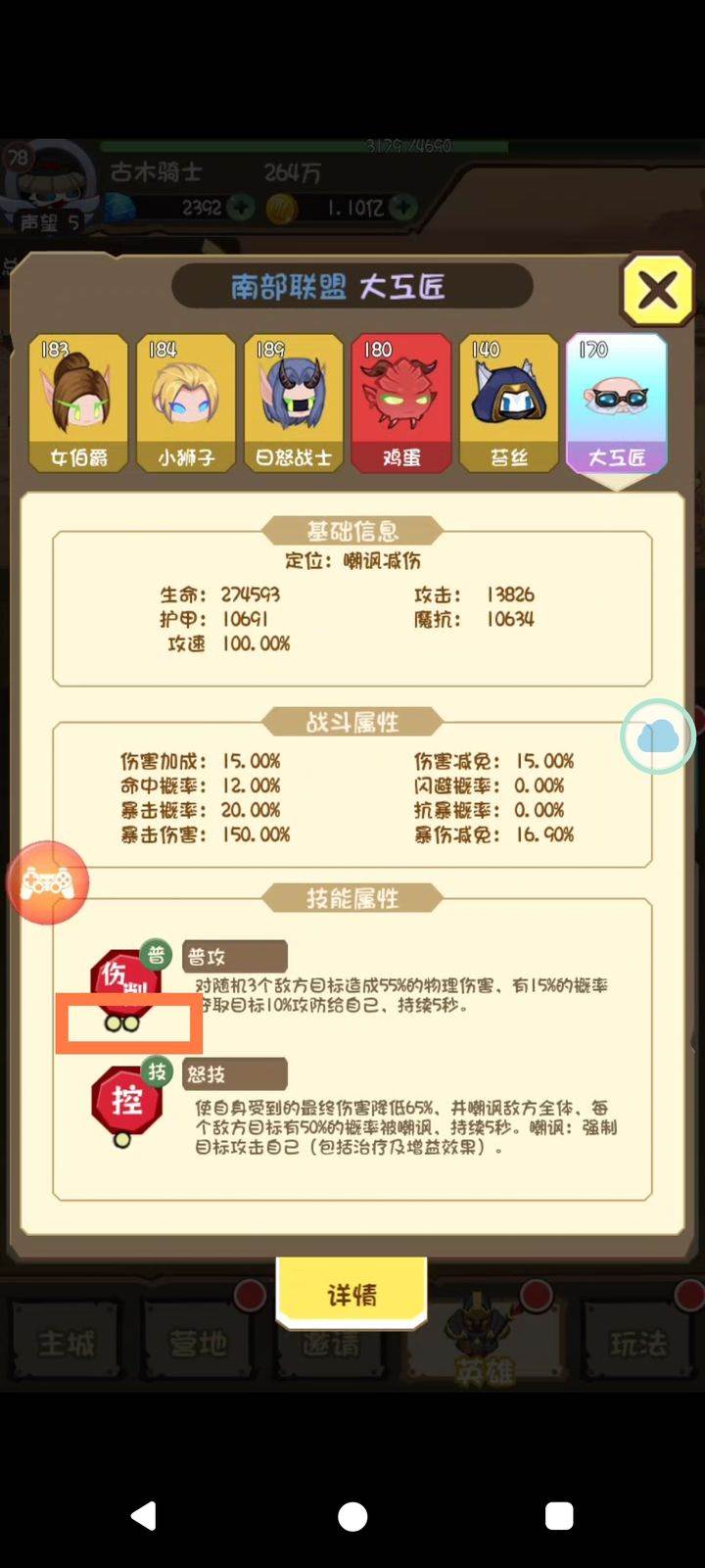 2.英雄品质影响技能等级,点击英雄查看技能时,技能下方有小点。技能等级在传奇品质后会变化,所以英雄最好使用传奇品质以上。注意注意注意:品质优先级大于属性值,很多英雄技能等级很关键,比如:小狮子怒气技能是群体恢复上限,传奇是恢复10%,而远古是20%,完全是质的飞越。图2