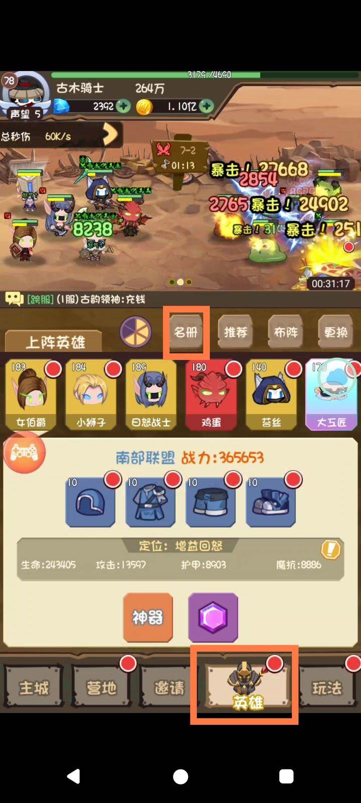 英雄都会有的!这很重要,有些卡关地方需要调整不同英雄布置来过关卡,比方说:试练时遇到专打后排的敌人需要把常用的前排放后排抵抗;遇到高肉需要减益英雄或者无视防御英雄上阵;遇到群嘲讽(大工匠和黑暗化身,治疗会奶敌且受增益buff)需要把治疗换成不是恢复百分比血量的,不然真打不死,除非碾压,等等!所以我们可以先大体看下英雄图鉴,了解下心中的强力英雄及合理搭配。指引:英雄-名册-图鉴(图1)