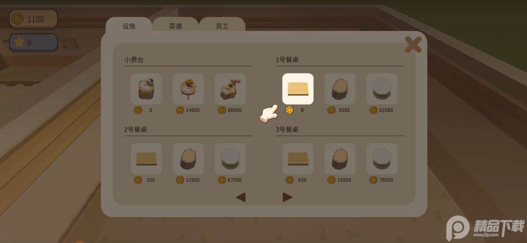 控制角色来到后厨,并在后厨摆设一张从教学引导处购买的免费餐桌。一张餐桌一次只可以接单一位客人,最多可以摆放6张餐桌。