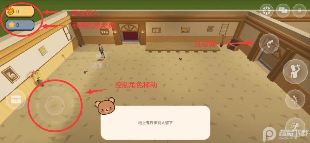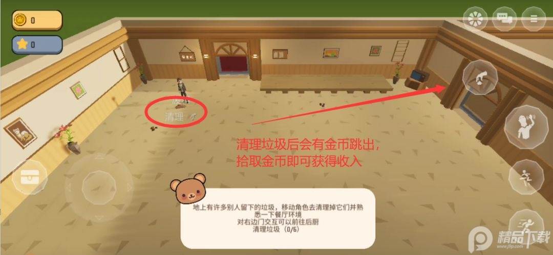 首先,岛主们需要学会如何打扫房间:控制角色来到垃圾旁边,点击“互动键”即可清理垃圾,清理完垃圾后,控制角色捡取地面弹出的金币即可获得收入,这是前期最基本的收入来源之一。