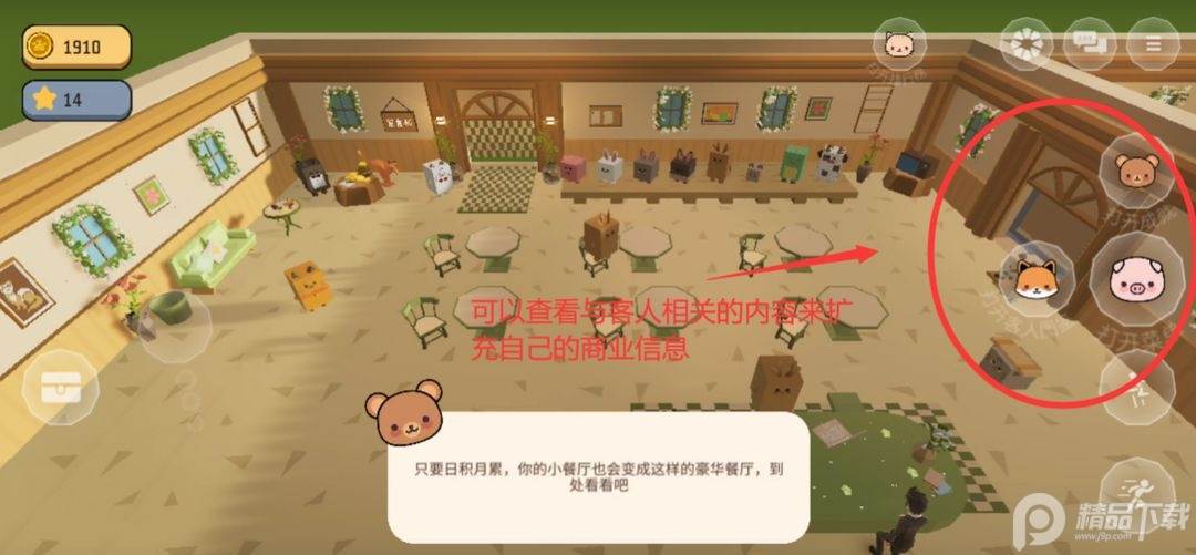岛主们还可以亲自在大街上拉客以招揽客人,提升营业额(部分客人的要求较高,需要我们具有较高的星级和菜单)。