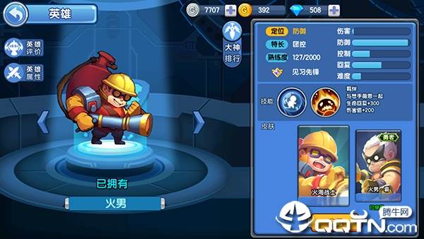 典型的坦克英雄,支持10000银币或者60钻石购买,亦可在新手登陆礼包里获得,火男具有很高的防御能力,而且技能拥有超强的辅助能力,但是因为是坦克所以普攻威力极差,主要使用近战来攻击