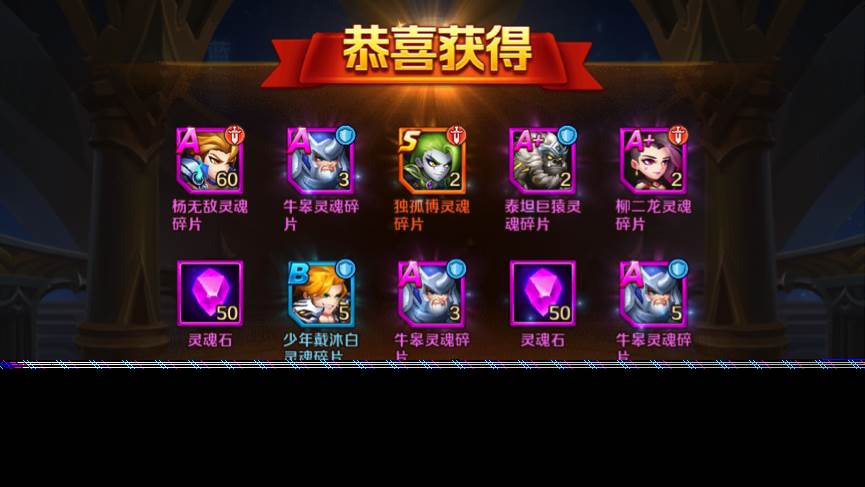 在斗魂场战斗无论胜利或失败,每场战斗均可以获得10斗魂积分,50积分可以领取2个万能碎片,而100积分就可以再领取10个万能碎片。