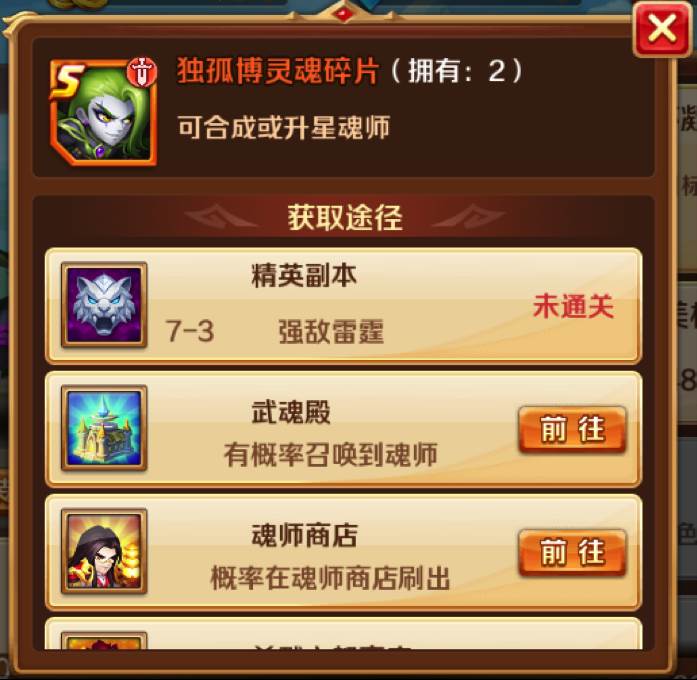 点开你想获取碎片的魂师,就会显示出通关哪个副本可以获取魂师碎片。如果是重点培养的魂师,建议可以花20钻石重置下副本,进行再次扫荡。每天通过副本获取魂师碎片也是一项好的选择。