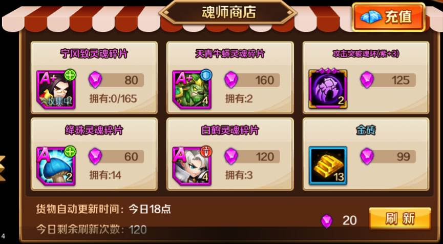 2.魂师商店每天都会赠送一定的刷新令,并且商店在9点、12点、18点、21点都会自动刷新,除了魂师商店外,还有斗魂商店宗门商店等,可以在不同的商店选择你需要的碎片进行购买。个人建议,商店是获取魂师的绝佳途径,不仅可以定向培养自己需要的魂师,获取碎片也比较稳定。