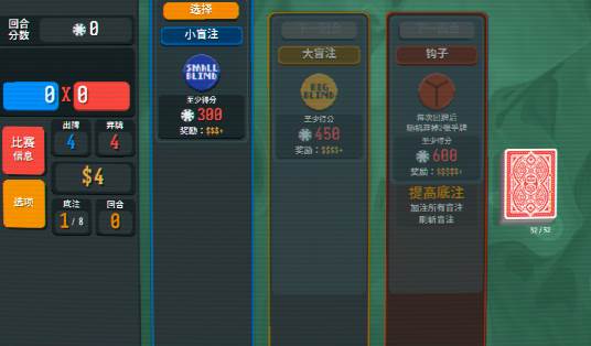 3.大小“盲注”关卡可跳过,玩家会获得一个奖励,但是也会失去金钱及进入商店的机会。