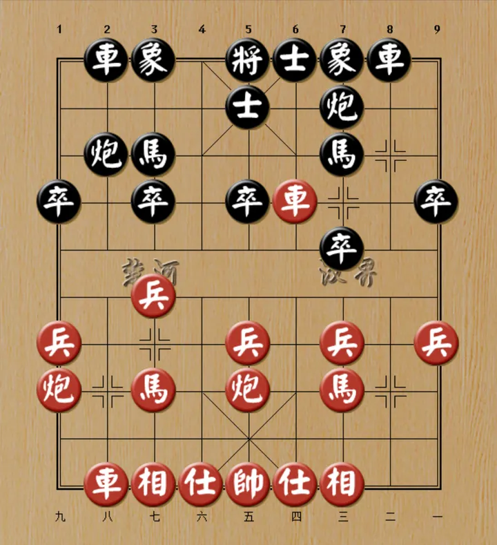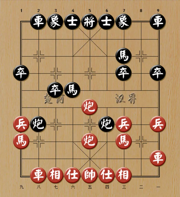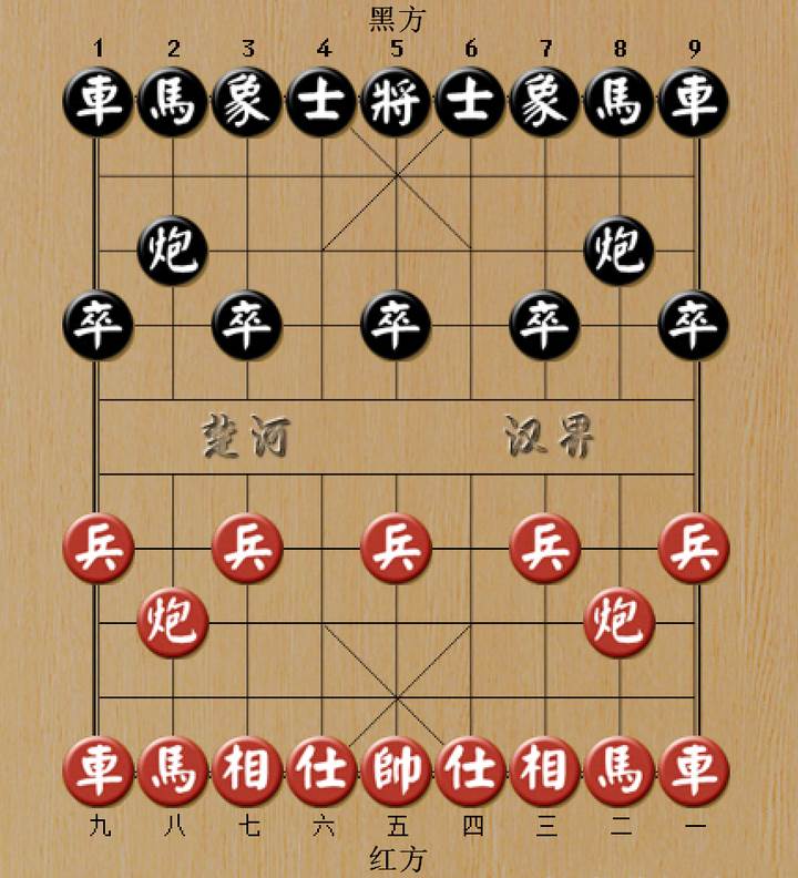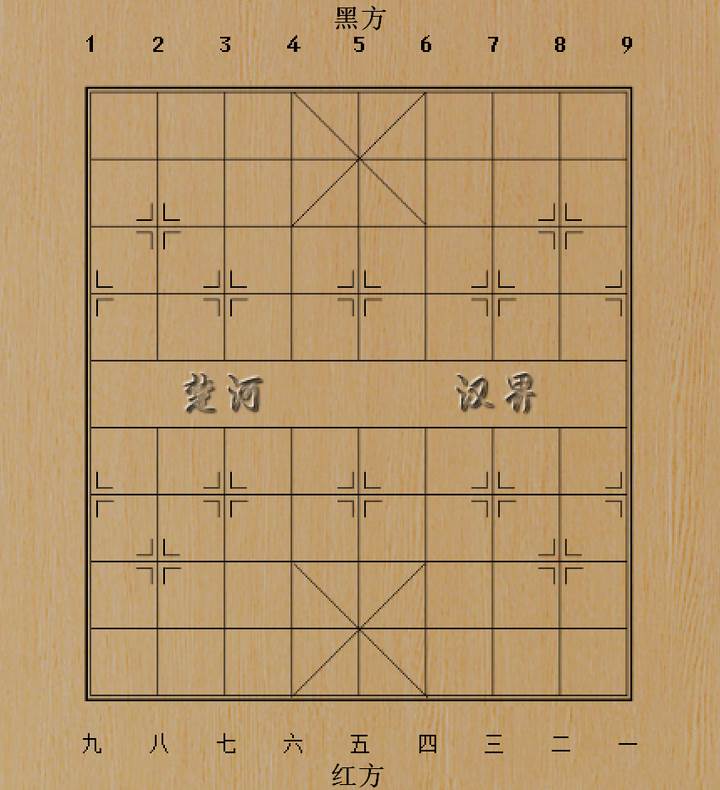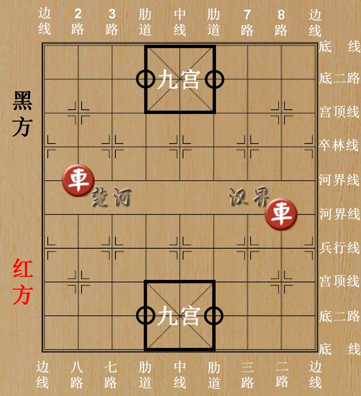 整个棋盘以河为界分为相等的两部分。为了比赛记录和学习棋谱方便起见,现行规则规定,九道直线,双方各依自己为准,红棋方面从右到左用中文数字一至九来代表;黑棋方面从右到左用阿拉伯数字 1 至 9 来代表。如图 1-1。