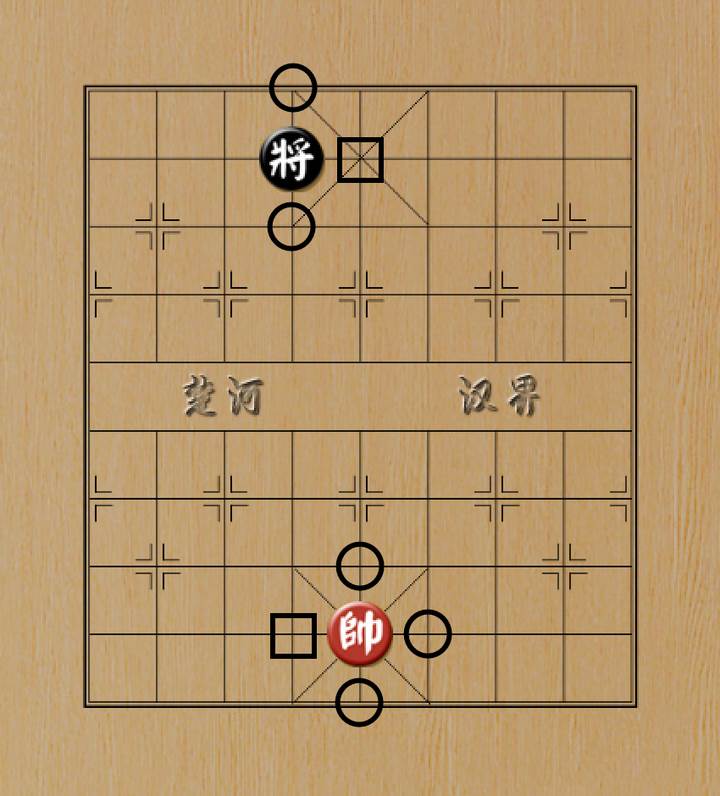 另外,关于帅和将还有一条很重要的规定,就是帅和将不准在同一直线上直接对面,即“明将”。如一方已先占据,另一方必须回避。如图 2-4 中的“矩形”点,是“明将”的位置,不能走。