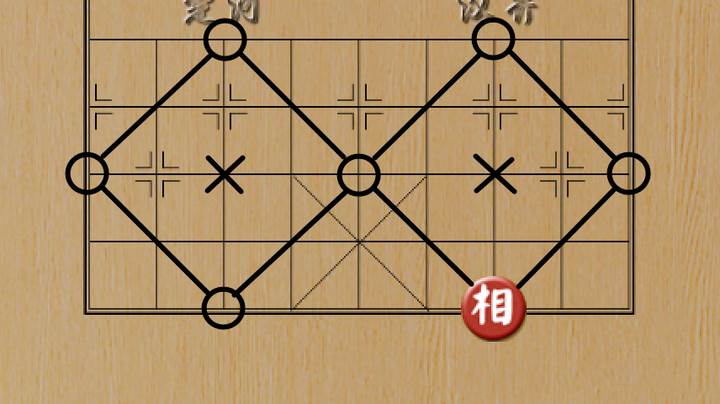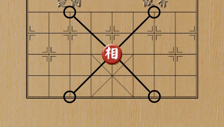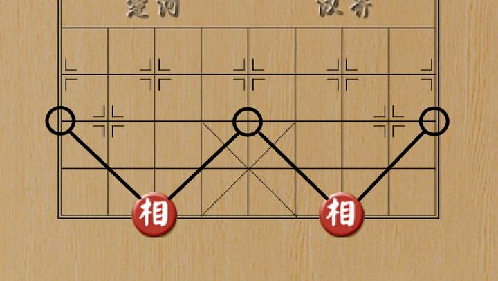 相(象)的走法是每次循对角线斜走两格,因为它走后的位置与原来的位置恰是一个“田”字的对角线两端,所以俗称“相走田”。如图 2-6、图 2-7 所示。相(象)的活动范围只限于己方阵地的七个点上,不准过河,如图 2-8。图中连线表示相的行走路线。