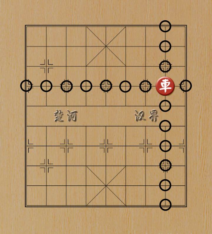 车的威力最大,它能直走,也能横走,能进能退。只要无其它棋子挡路,无论远近,均可到达,行走的步数不限,但不可隔子而行。车是速度最快的兵种,一车可以控制十七个点,故有“一车十子寒”之说。如图 2-10 所示。