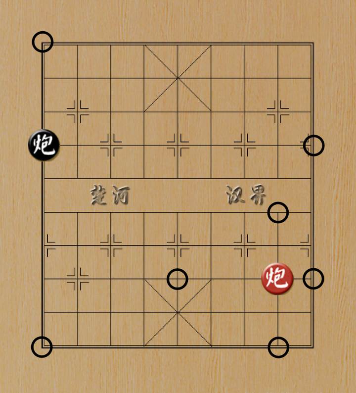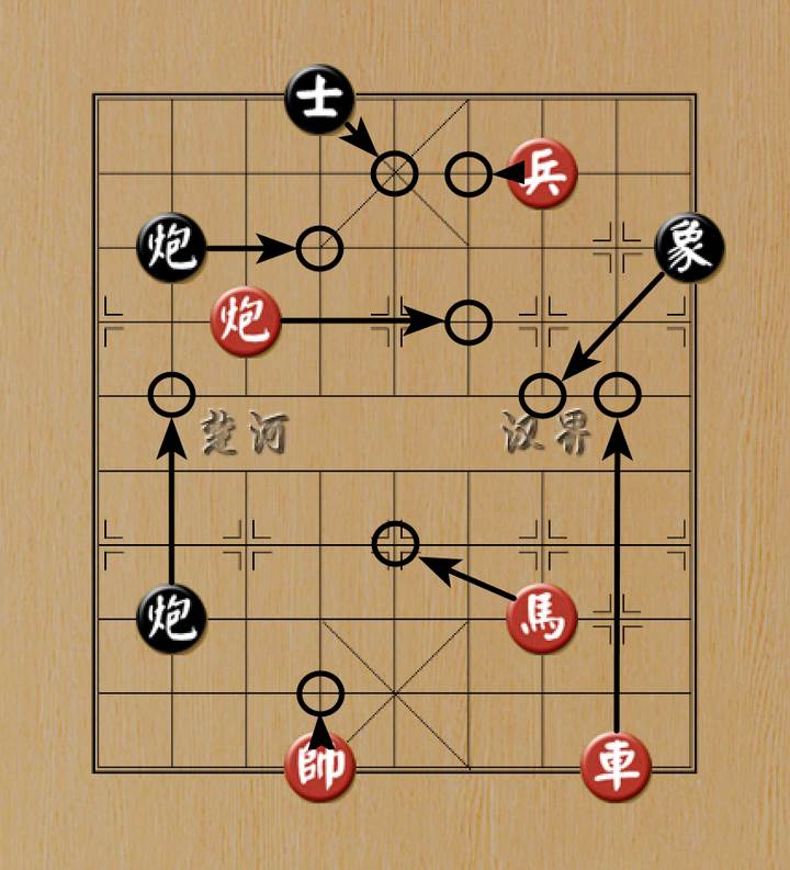 炮在不吃子的时候,走动的方法与车完全相同。或直或横,或左或右,或前或后,或远或近,都由自己选择。如图 2-11。