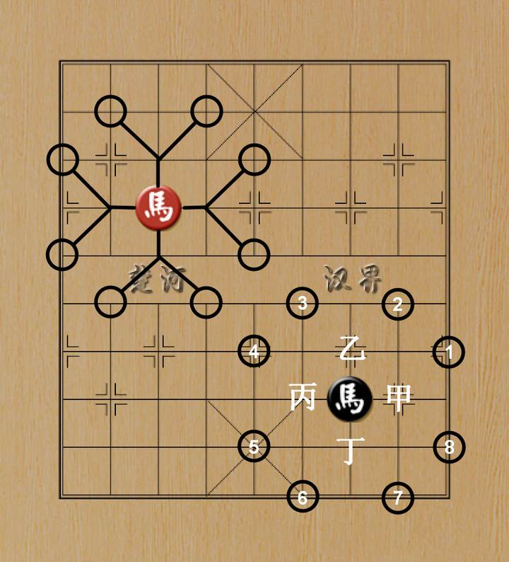 如果在一直或一横的地方有一个棋子(无论是自己的还是对方的),马都不能跳过去,俗称“蹩(bié)马腿”。如图 2-12 所示。如果马的四周甲、乙、丙、丁处没有棋子,马可以分别跳到 1——8 位。如果甲点有子,则不能到达 1、8 位;乙点有子则不能到达 2、3 位;丙点有子不能到达 4、5 位;丁点有子不能到达 6、7 位。