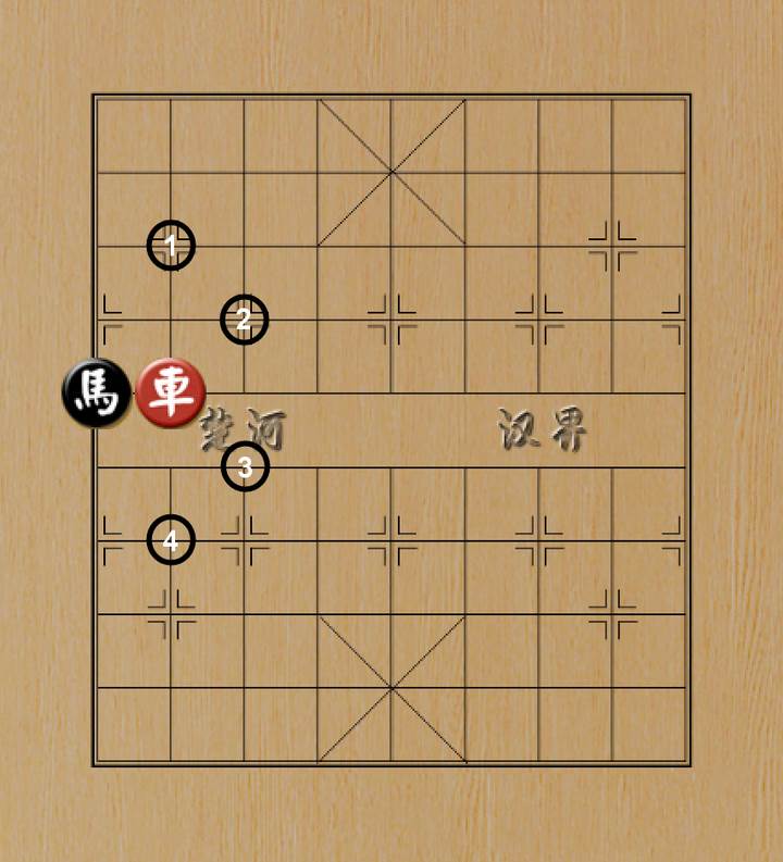马虽有“八面威风”,但怕“蹩腿”,所以它也有致命的弱点。如图 2-13 所示:如果没有红车,黑边马可以分别跳到 1——4 位。但红车往马旁边一“靠”,则 2、3 位不能跳了,所能到达的 1、4 位,又是车控制的范围,马无路可逃了。有句谚语说“马逢边必亡!”指的就是这种情况。