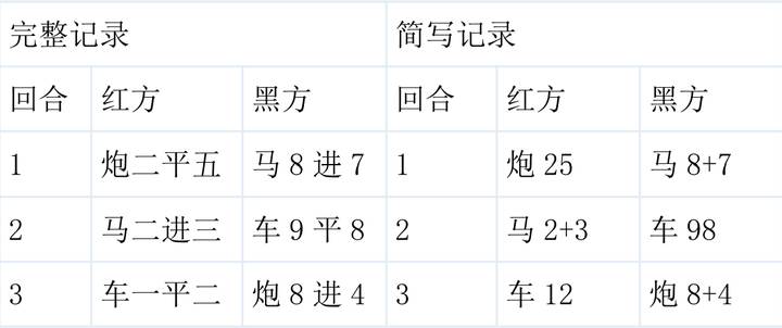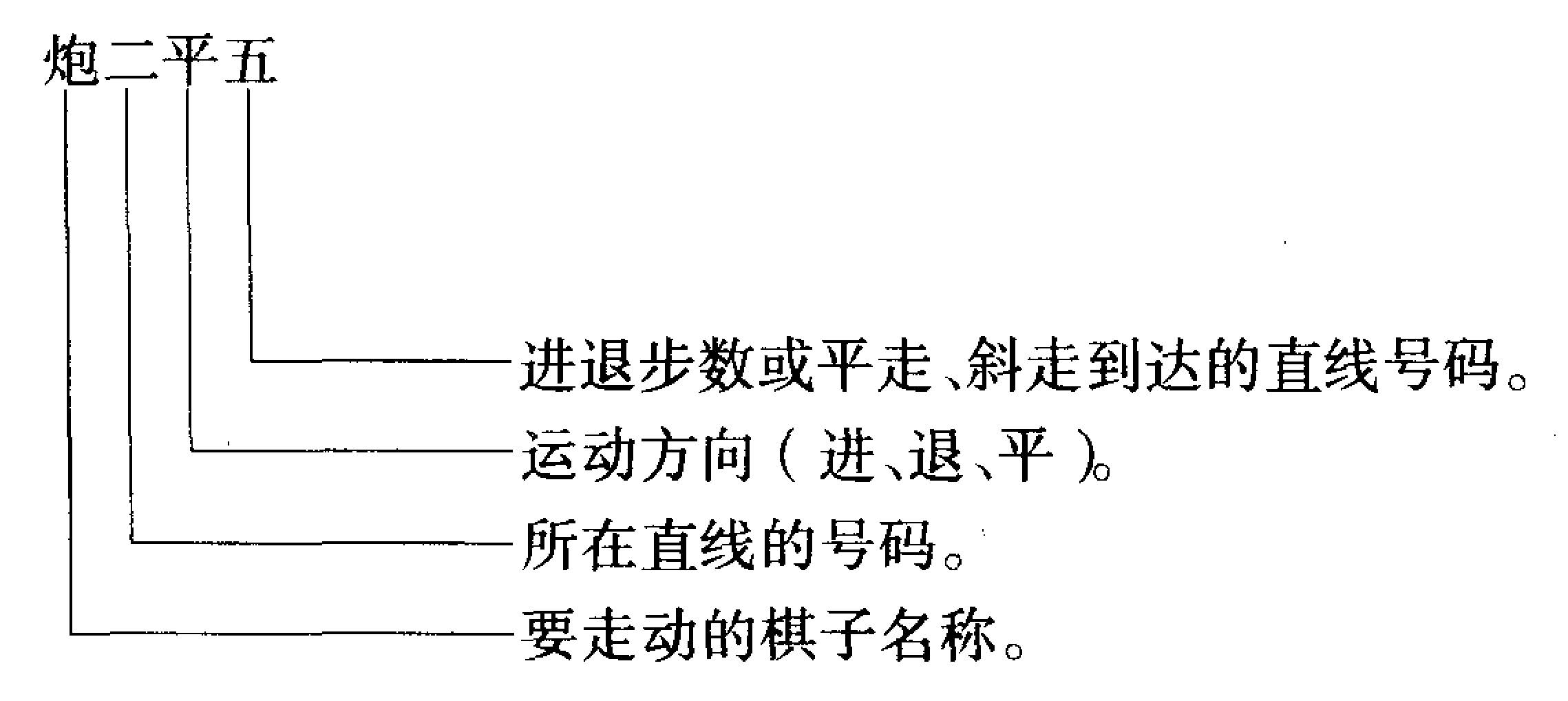 每一着棋用四个字来表达。第一个字是所走动的棋子的名称,如“车”、“马”、“卒”等;第二个字是所走动的棋子原来所在直线的号码,这与棋子的颜色有关。红方用中文数字一到九表示,黑方用阿拉伯数字 1 到 9 表示;第三个是棋子所走的方向,用“进”、“退”、“平”三个字表示: