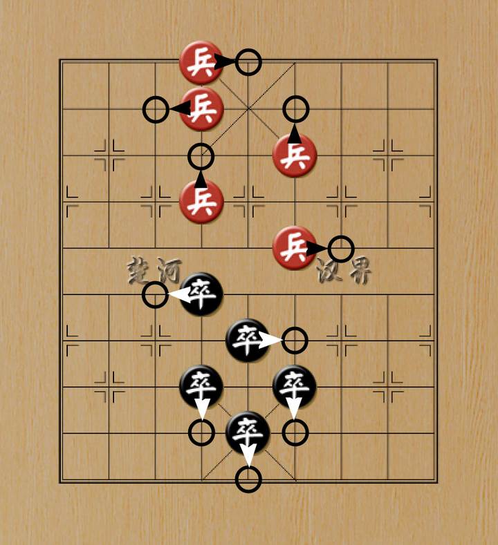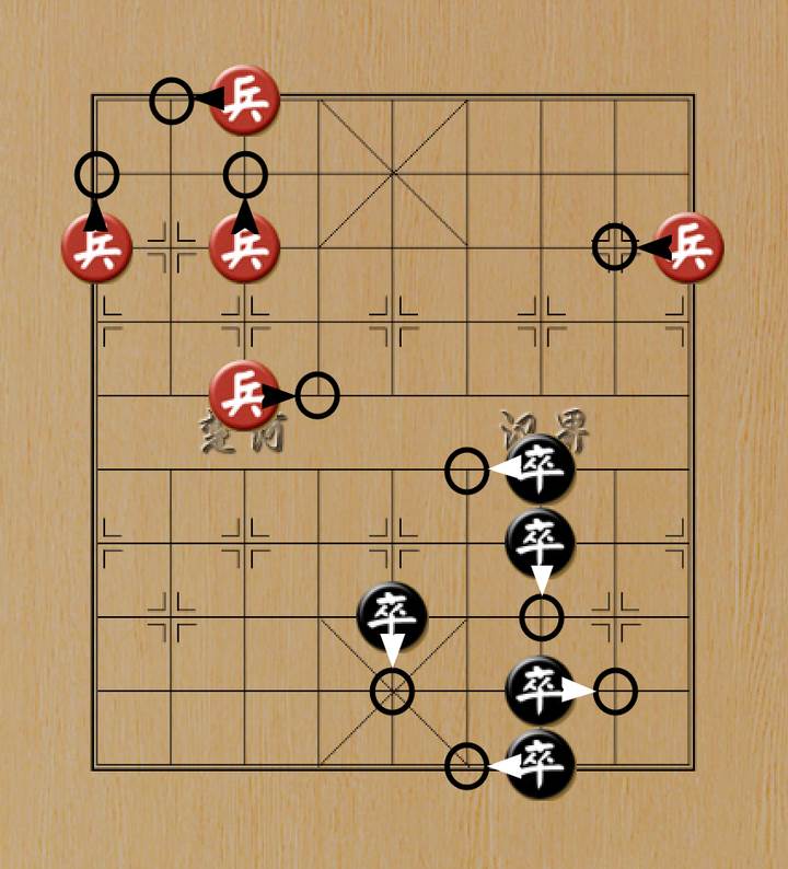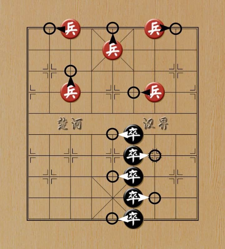 兵(卒)的战斗力最弱,数量最多,双方各有五个兵(卒),速度最慢,每次只能行走一步。兵(卒)是双方的第一道屏障,最富有牺牲精神,勇往直前,永不后退。兵(卒)没过河之前,走动时只能向前走一个交叉点。“过河”以后行走的方向增加到三个,即向前、向左或向右,,每次也只限走一格,但仍不准后退。如图 2-14 所示。