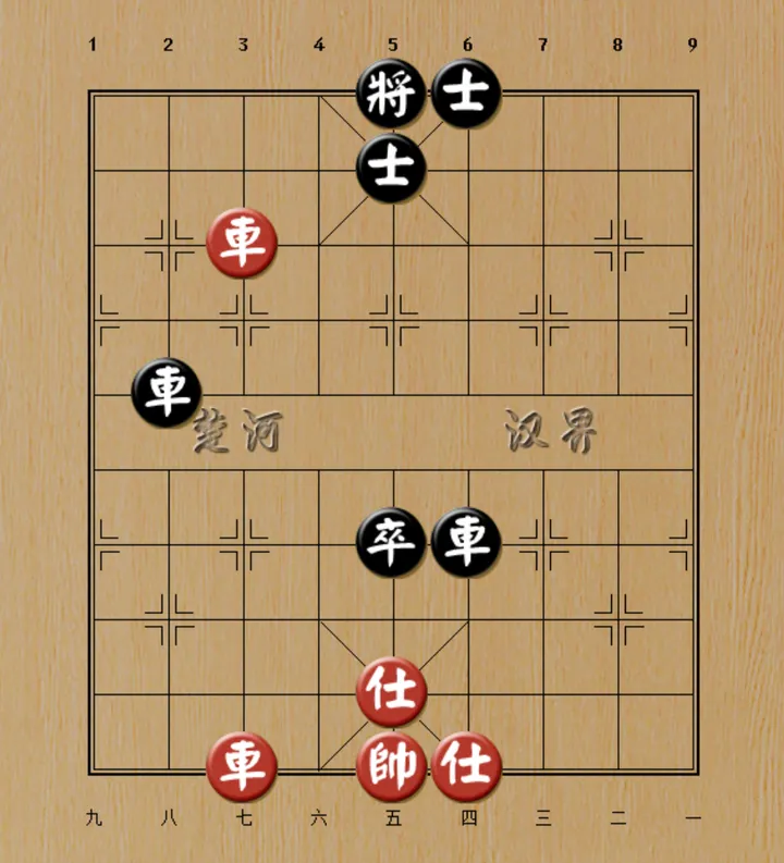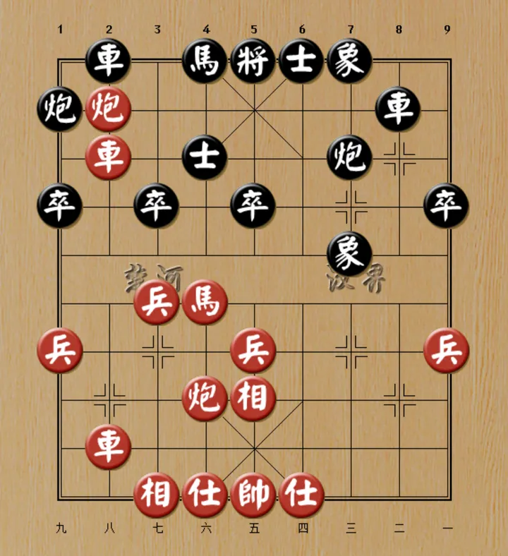 记录规定红方用中文数字一到九、黑方用阿拉伯数字 1 到 9 来表示自己的棋子在哪条竖线。请棋友们一定要注意:红方和黑方都以本方棋盘的底线为标准从右向左依次排列(见图 1-1)。如果一方除兵(卒)以外的相同兵种的子在同一道直线上,或一方有 2 个兵(卒)在同一道直线上且没有 2 个以上兵(卒)在其它某一道直线上,在走动其一时,记录应用“前”“后”来表明。仕(士)、相(象)不需要以“前”“后”来判断,因为纵使是在同一直线上,也可以凭第三个字(“进”或“退”)知道是移动哪一只。如图 4-2 所示。