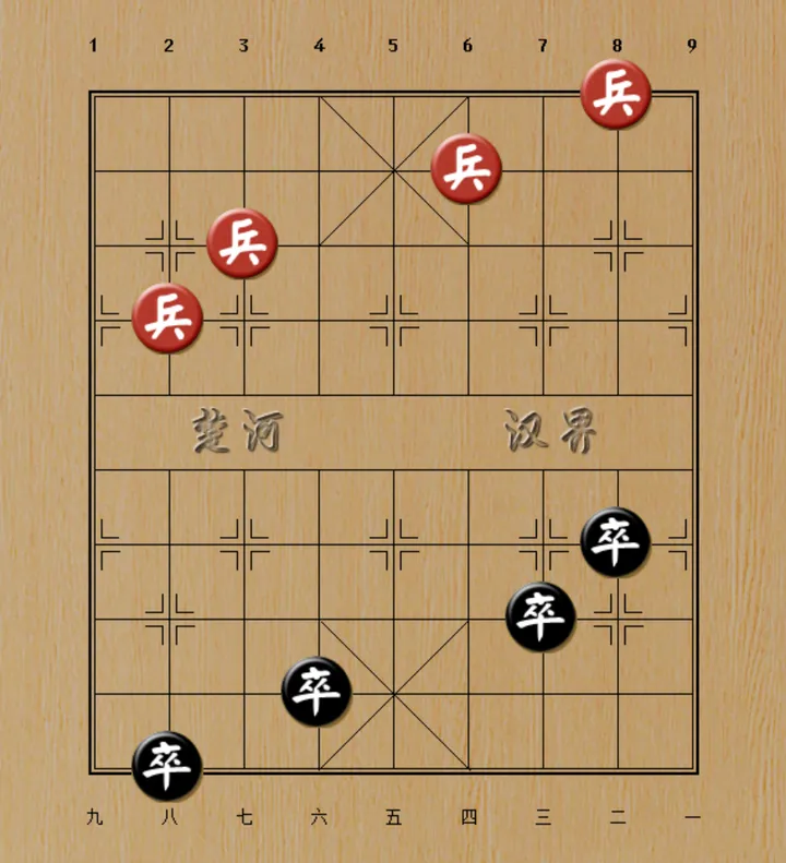 当一方兵(卒)在两道直线上都达到 2 个以上时,对这两道直线上的兵(卒),按从右至左、从前至后的顺序用一、二、三、四(或一、二、三、四、五)区分。