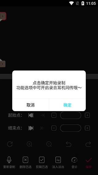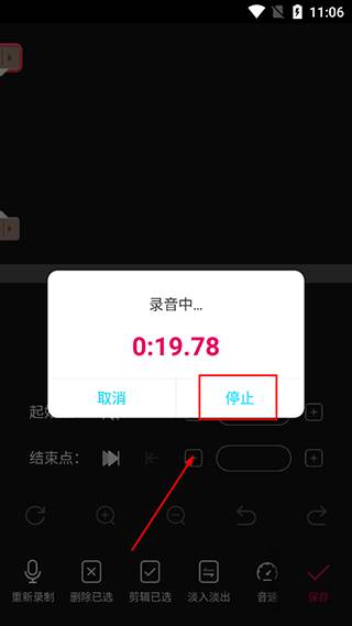 (4)录音完成后会进入剪辑页面,如果觉得那段不好,在剪辑界面就可以选择自己需要剪辑的录音音频时间段,可以左右拖动选择,也可以在编辑框里面输入需要剪辑的开始时间和结束时间;开始时间和结束时间确定后,点击剪辑页面的保存按钮,就会得到你想要的那段时间内录音的音频了。