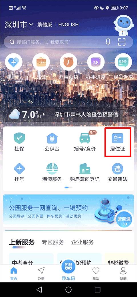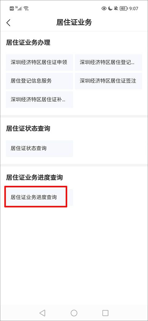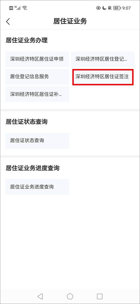 2、在居住证业务界面,找到并点击“深圳经济特区居住证签注”选项;