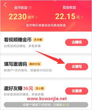2、邀请好友注册快手极速版并且登陆,获得邀请码,使用邀请码也可以获得金币红包。