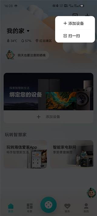 1、打开海信爱家APP,点击添加设备或者点击页面右上角的“+”按钮。