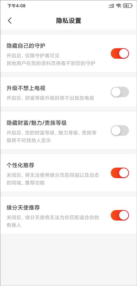 4、隐私设置界面点击“隐藏自已的守护”后面的圆点