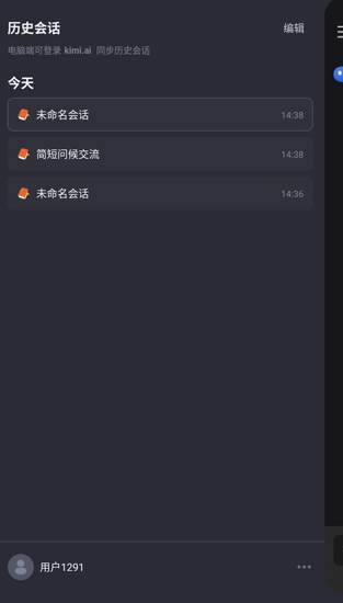 4.点击界面左上角的“三”图标,即可打开菜单,查看历史对话记录,或进行账号切换等操作。