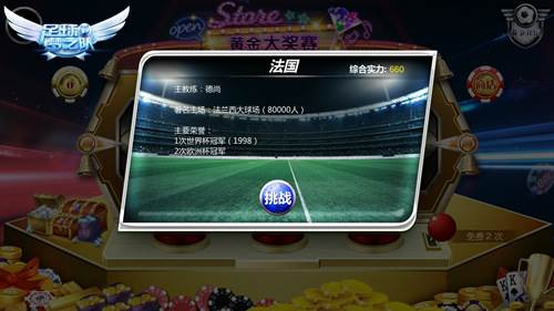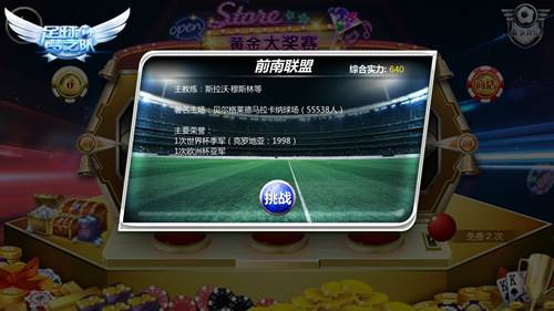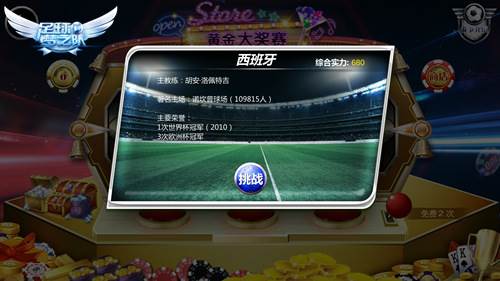 进入黄金赛界面,你将看到金光闪闪的满地金币筹码和一台老虎机。每天你可以有两次免费比赛机会,也可以通过消耗钻石购买更多机会。老虎机会为你随机提供3名对手,出现相同国旗数越多,进球后的奖励也越多。