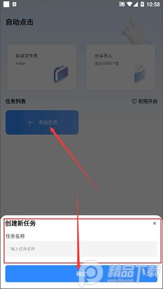 1、打开自动按键点击app,进入软件后授予软件运行所必需的权限,在首页的“任务列表”下点击“添加任务”,输入任务名称,点击确定即可进行下一步。