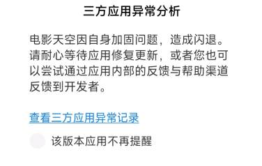当您使用第三方应用时,发生了异常,如闪退等,系统会弹出通知,告知您问题的原因,并提示相关的解决方案。我们将持续优化与迭代产品,为您带来更多帮助,期待您的反馈与建议