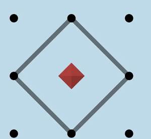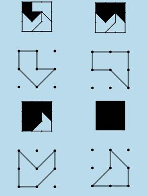 10、第10关点击方块之间的间隙会出现连接线,点击连接线可使其改变方向。连接线可以将方块连接,与彩色方块连接的方块会变成彩色,使所有方块变成彩色即可通关。一种通关方式如图所示。红宝石藏在随机一个黑色方块中,该方块变成彩色时会显示出红宝石的轮廓图中红圈的地方,之后点击此方块可以拿到红宝石。