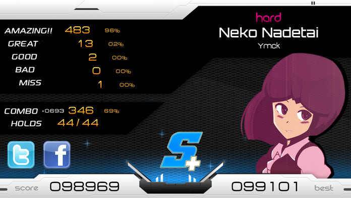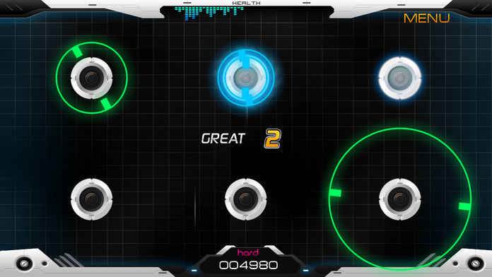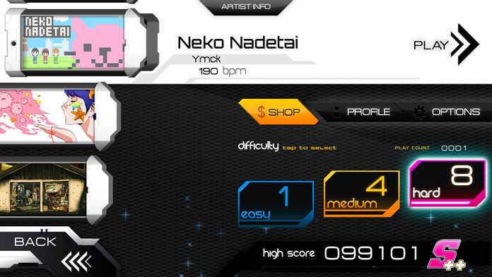 每首曲子都分为简单、普通、困难三个模式,所有程度的玩家都能在最开始就找到合适自己的难度。除此之外,游戏还为所有曲目增加了一个练习模式,在这个模式中歌曲的速度会被放慢,以便玩家更好的辨识复杂的节拍,但练习模式中的歌曲是被硬性拉长的,有时会产生一些杂音,让人略感不爽。