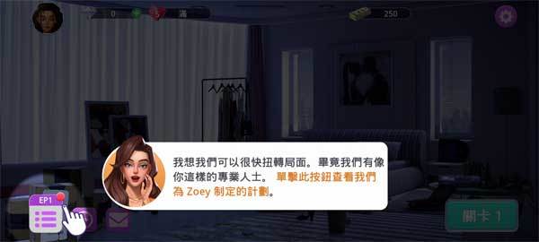 1、进入游戏之后,点击左上角的地球按钮,选择“繁体中文”,选择好之后开始游戏。第一步就是点击左下方的菜单键来查看为女主角制定的计划。